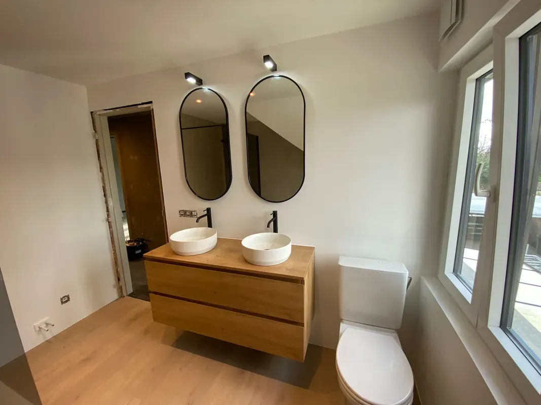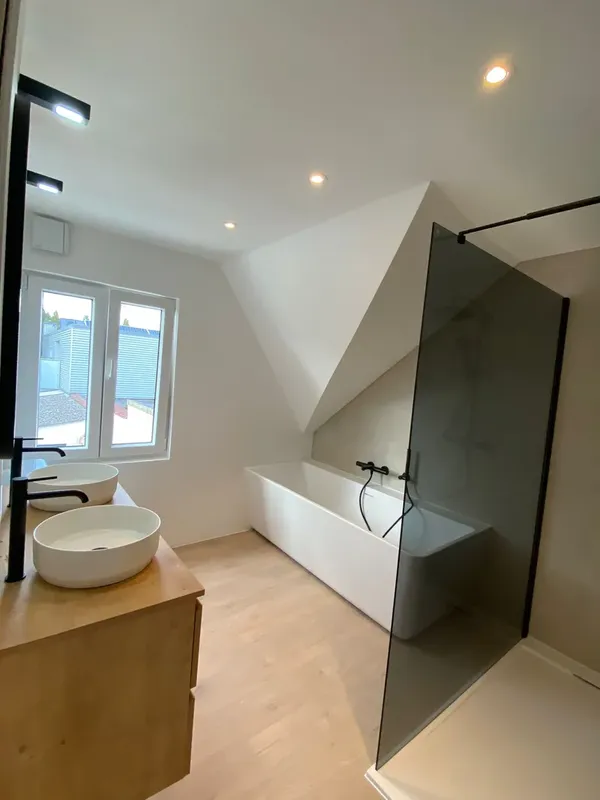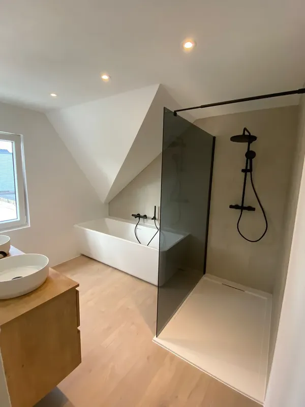 Samen met de klant hebben we de opmaak gepland en het design gekozen. Water, elektriciteit en ventilatie werd nieuw voorzien en werd klaar gezet om de tegels en de meubels te plaatsen. Na de plaatsing hebben we de badkamer mooi afgwerkt door een verflaag, verlichting, afgekit en alles proper opkuisen.